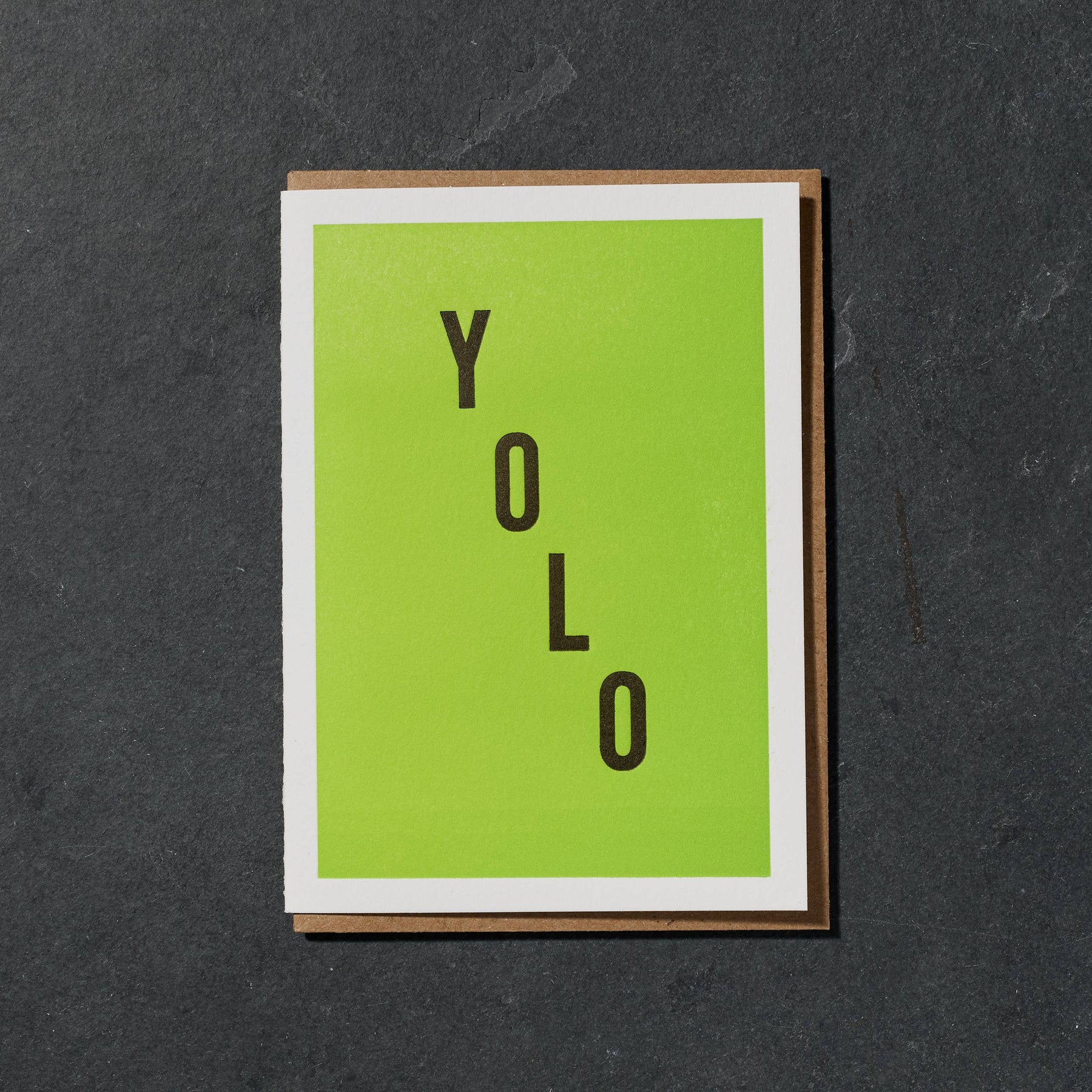 You only live once, so, Carpe Diem! YOLO green card in a true BRAT color. Letterpress printed by hand on 100% cotton rag paper.