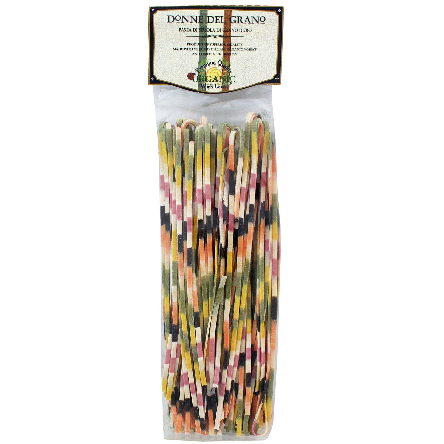 This beautiful colored Linguine Mare (Little Tongues of the Sea) pasta from Donne Del Grano, is made from premium durham wheat. The amazing colors all come from natural ingredients: spinach green, squid ink black, golden turmeric, red paprika and beets that all combine to create a fantastic rainbow array of colors. Cooks in 6 minutes to achieve optimum flavor and aroma.