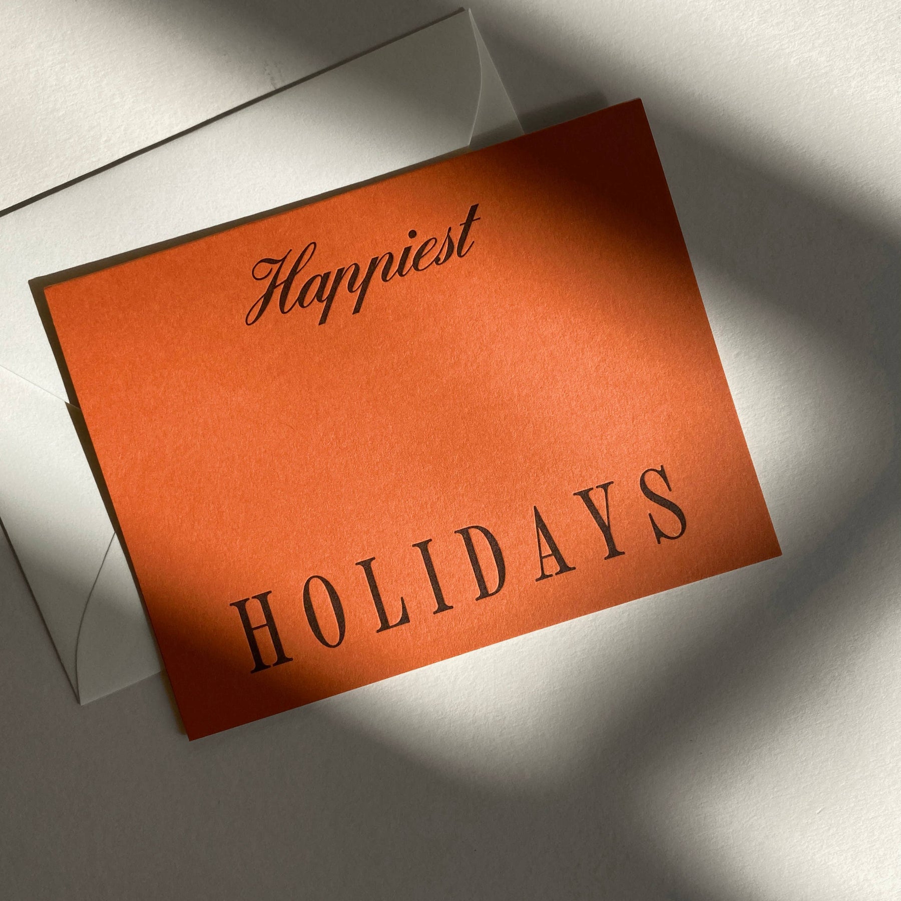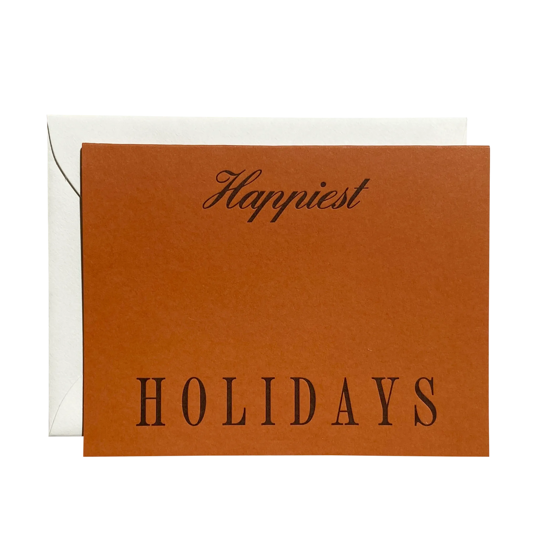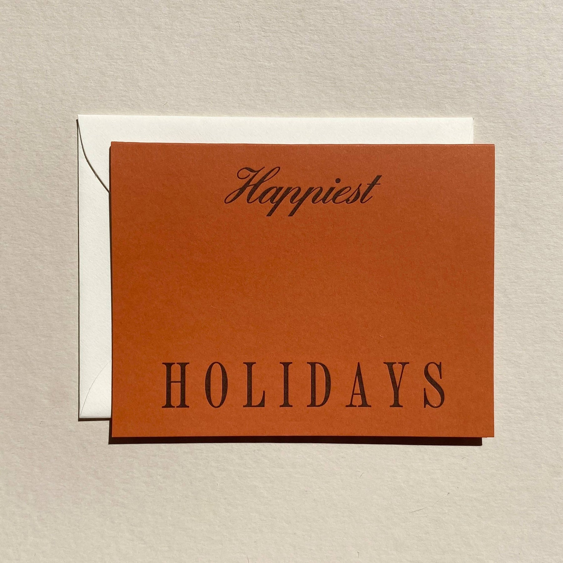 * A2 Folded 4.25" L × 5.5" W * "Happiest Holidays" * Rust Cover Stock * Letterpress * Natural Envelope * Blank interior * Made in Santa Barbara